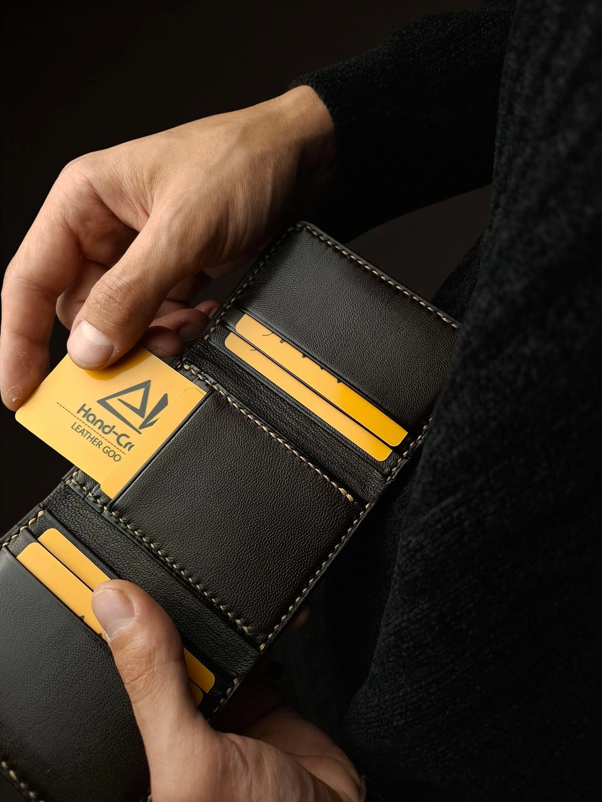"الخياطة اليدوية هي العلامة الفارقة لكل قطعة فاخرة تُصنع بإتقان. كل غرزة تُنفَّذ بعناية دقيقة تمنح المنتج قوة استثنائية وتفاصيل لا يمكن للماكينات تكرارها. هذا الأسلوب يمنح كل قطعة شخصية خاصة ولمسة فنية تُشعرك بأن ما بين يديك عمل متقَن يتوارثه الزمن."