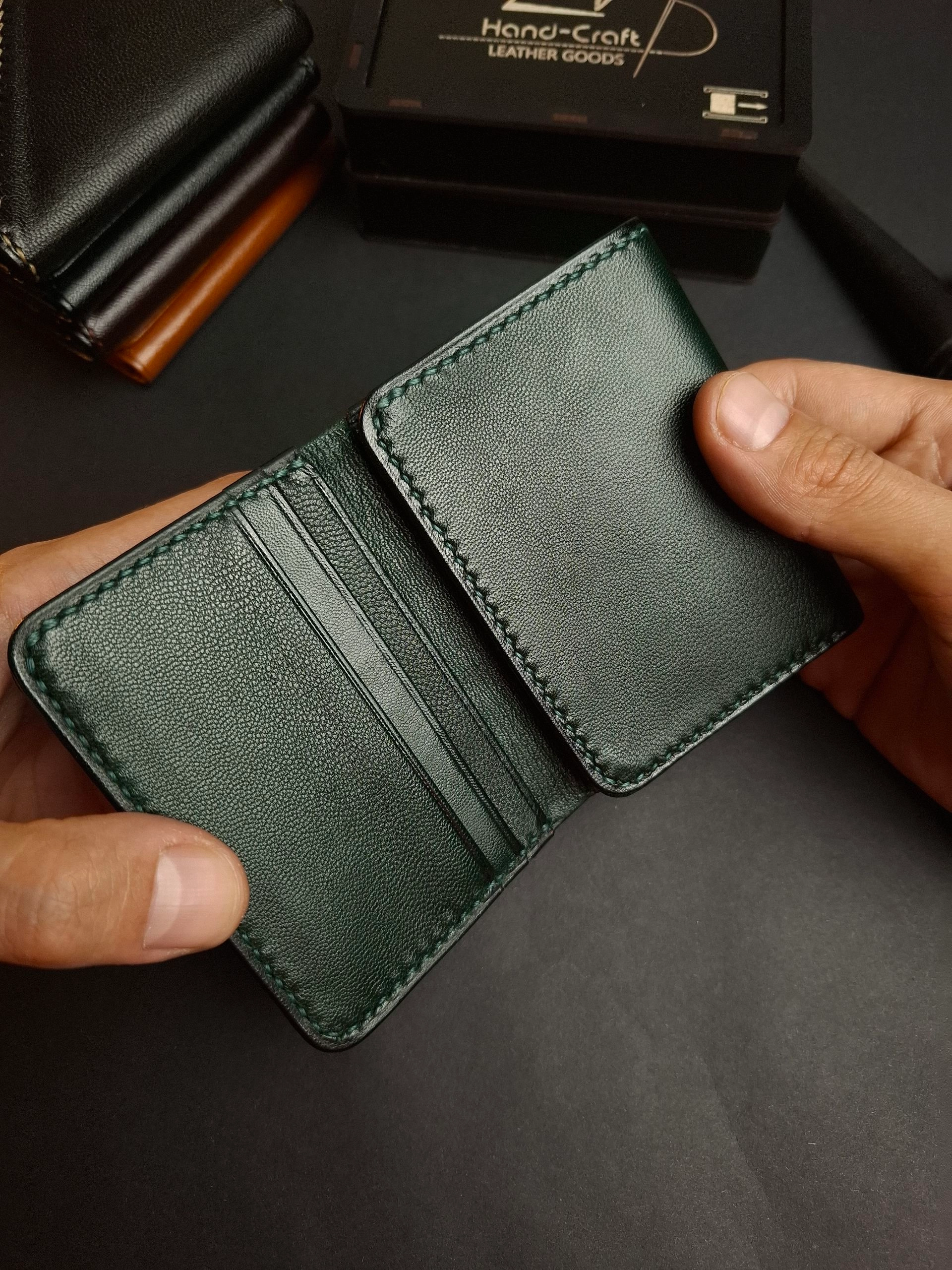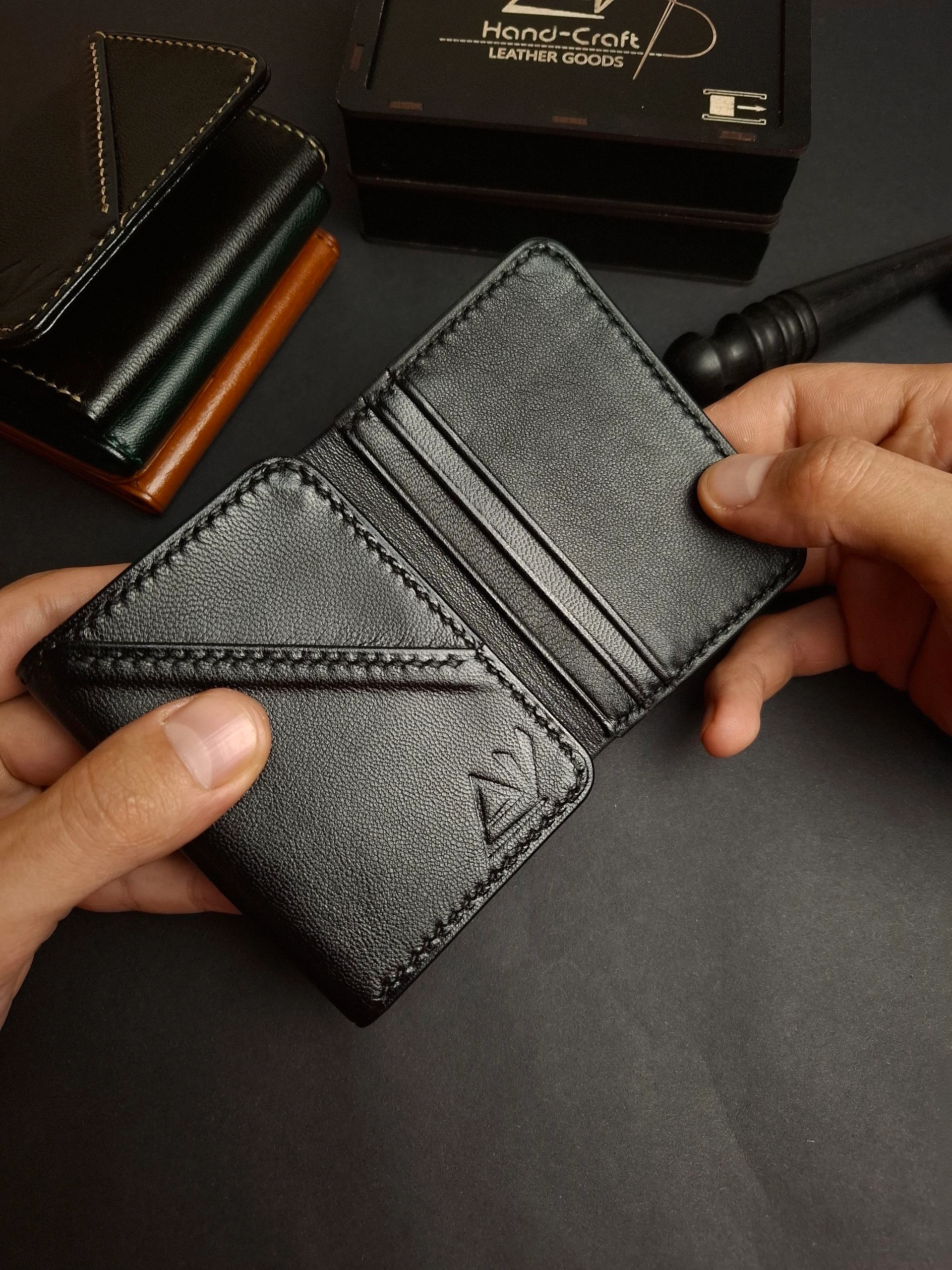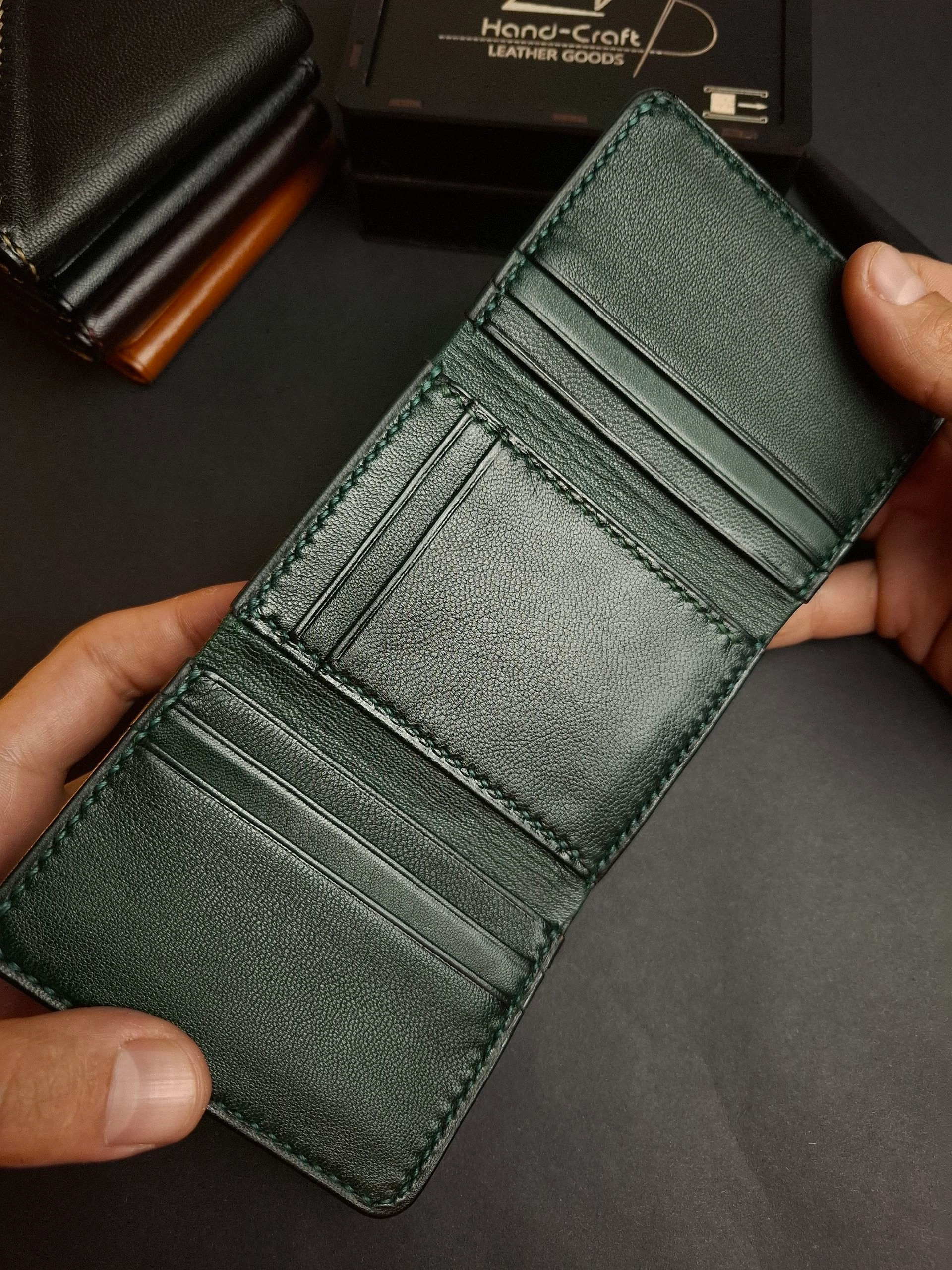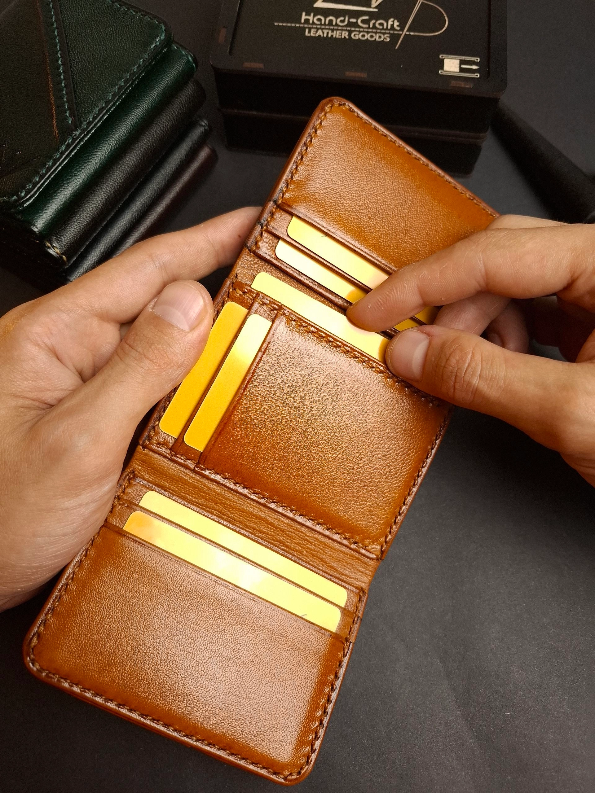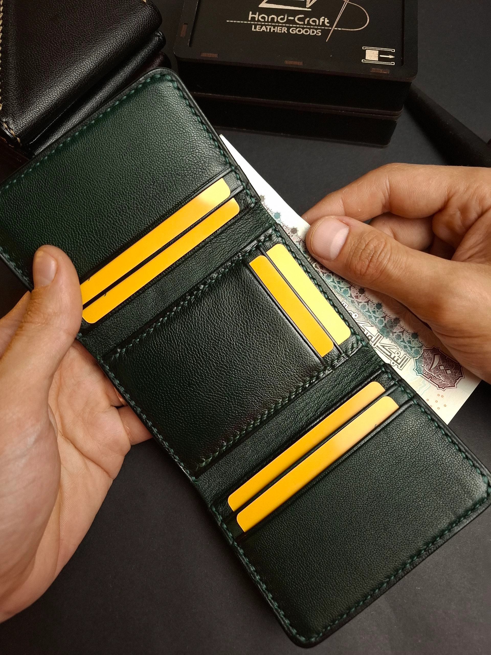 محفظة ثلاثية فخمة من الجلد الطبيعي بصناعة وخياطة يدوية بالكامل . بتقدملك توازن مثالى بين الراحة والعملية .